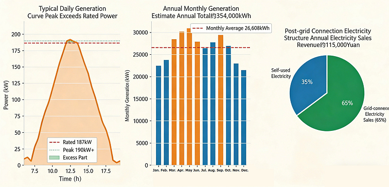 Project overview: 187 kW installed capacity, daily generation 970 kWh, peak output over 190 kW (exceeding rated value). The customer once considered removing some panels, but ultimately chose to feed surplus power into the grid.